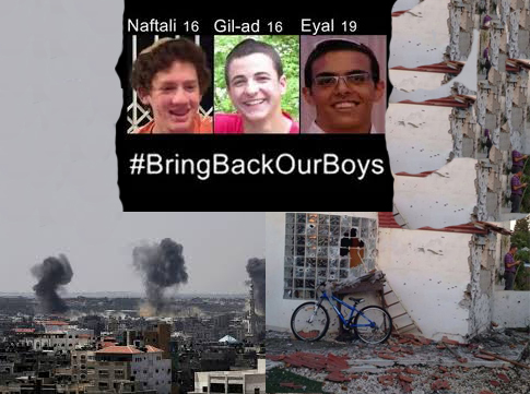 The 3 dead Boys (top); Strikes on Gaza (bottom left); Rocket attack on Israel (bottom right)
